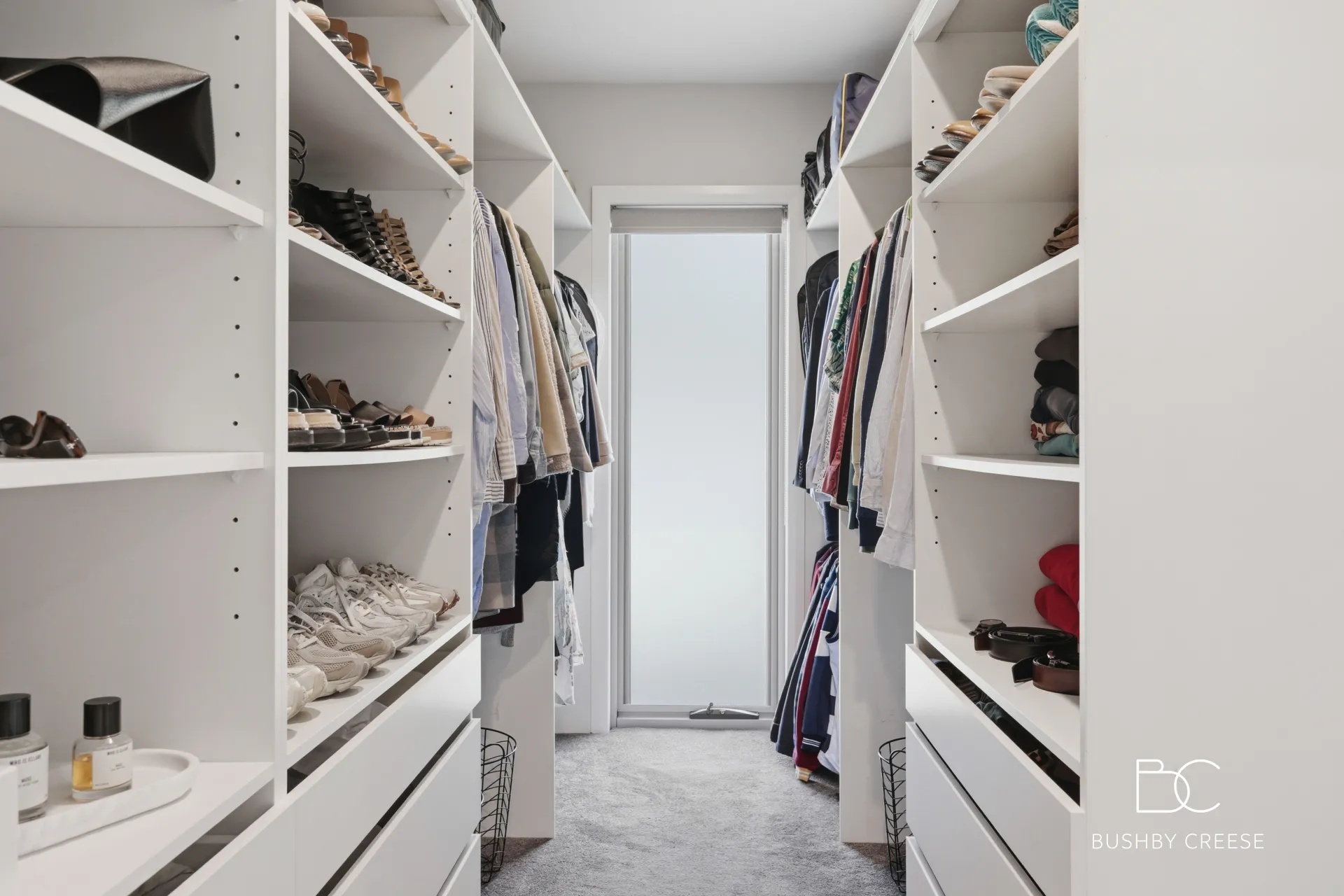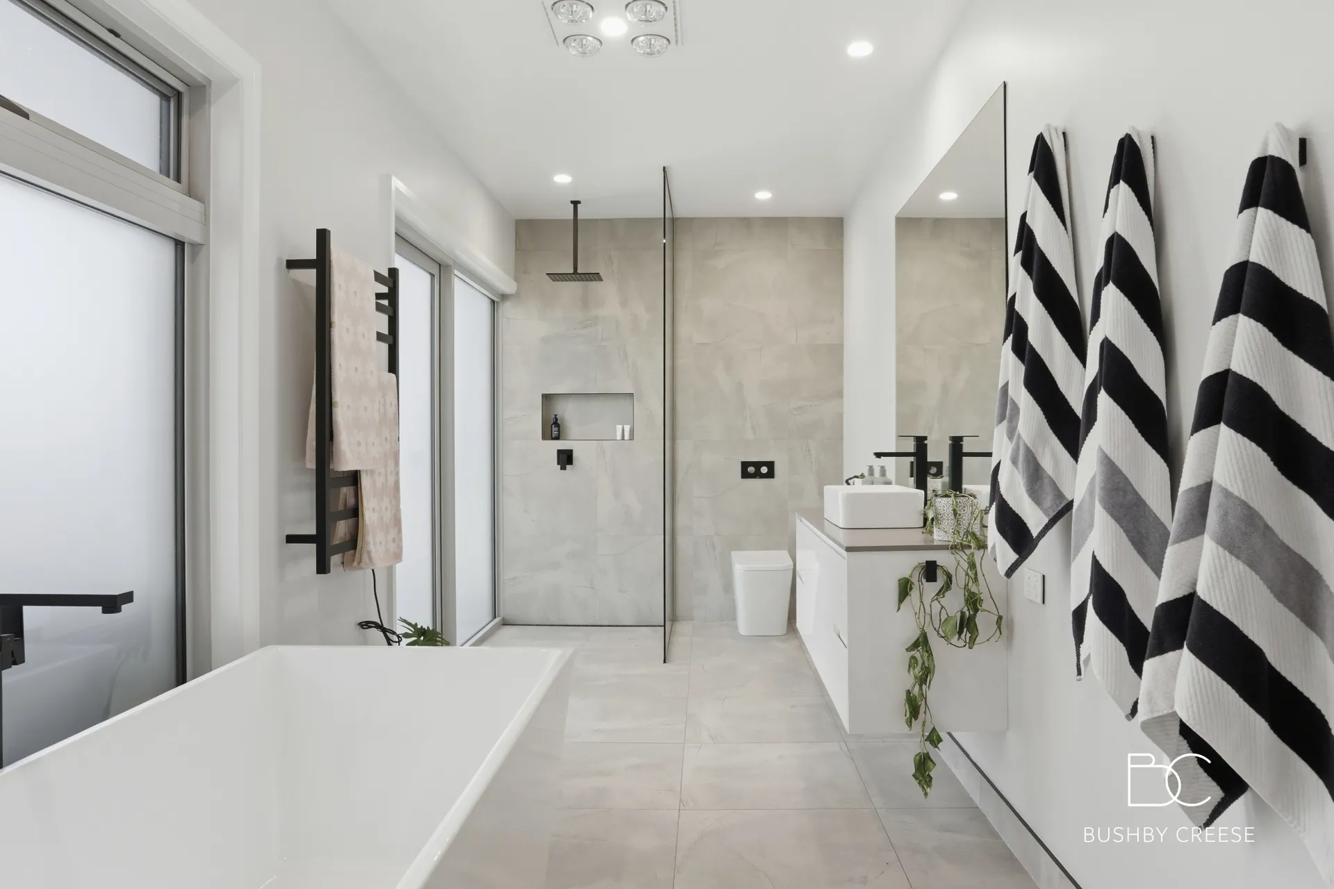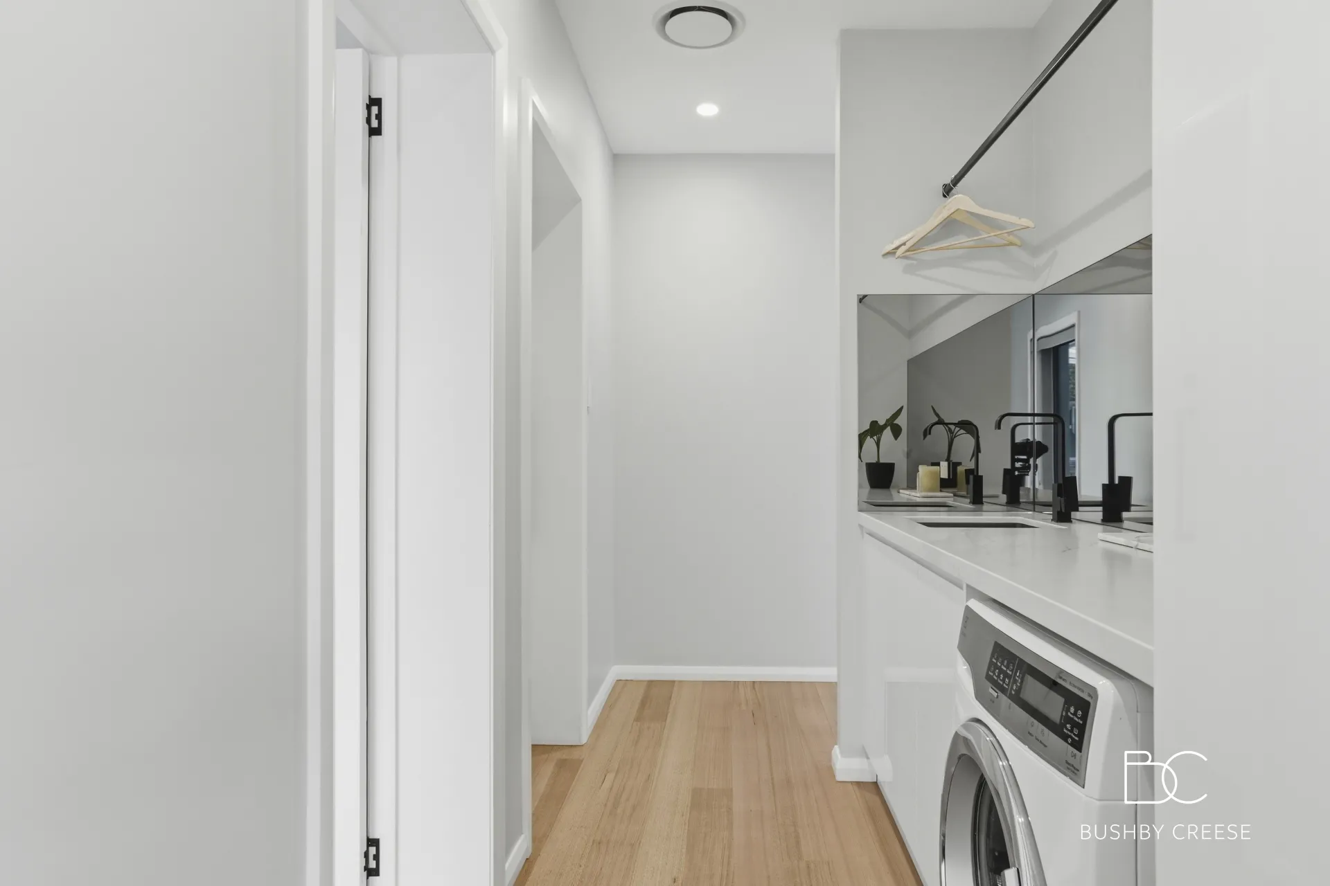 The main bathroom is luxuriously spacious and beautifully finished with a spa-like ambiance. Floor-to-ceiling tiling, frosted glass elements, and striking matte black fittings and fixtures create a contemporary sanctuary, complete with a bath, walk-in shower, vanity, and toilet. A European laundry is neatly positioned adjacent to the bathroom for practical everyday use.