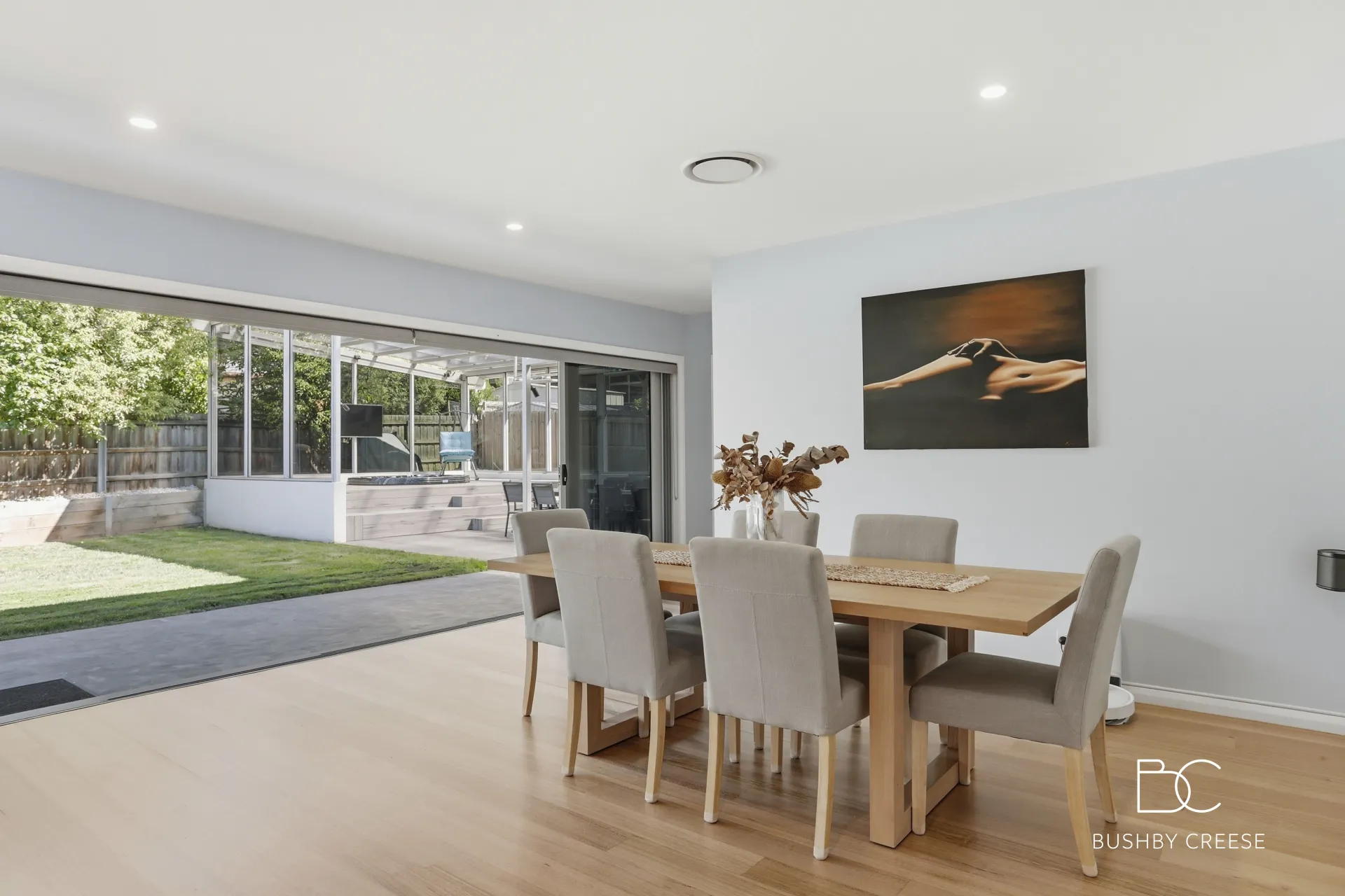 From the moment of entry, timeless elegance is evident at every turn. The spacious, sun-filled layout has been thoughtfully designed for contemporary living. At its heart, an open-plan family lounge room featuring custom-built shelving flows seamlessly into the dining area, creating a welcoming space for gathering and relaxation.