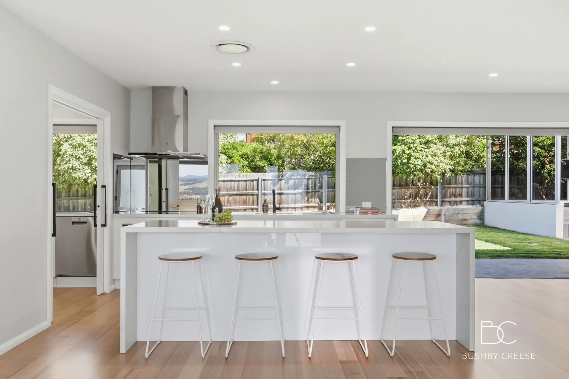 Returning inside, the kitchen is designed for both practicality and style, featuring abundant storage, high-end appliances, expansive countertops, and a generous central island with breakfast bar. A highly sought-after butler's pantry further enhances the functionality of the space.