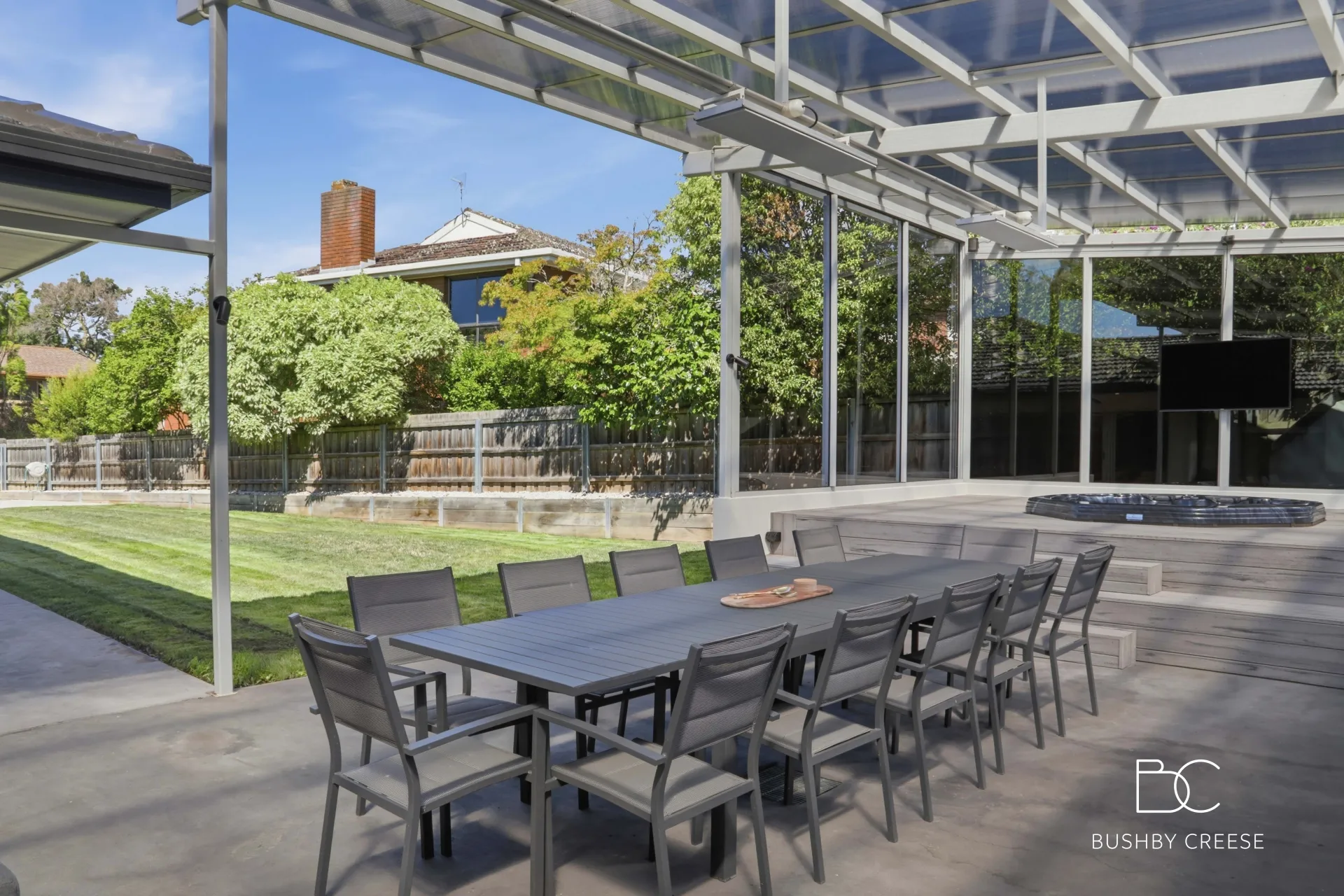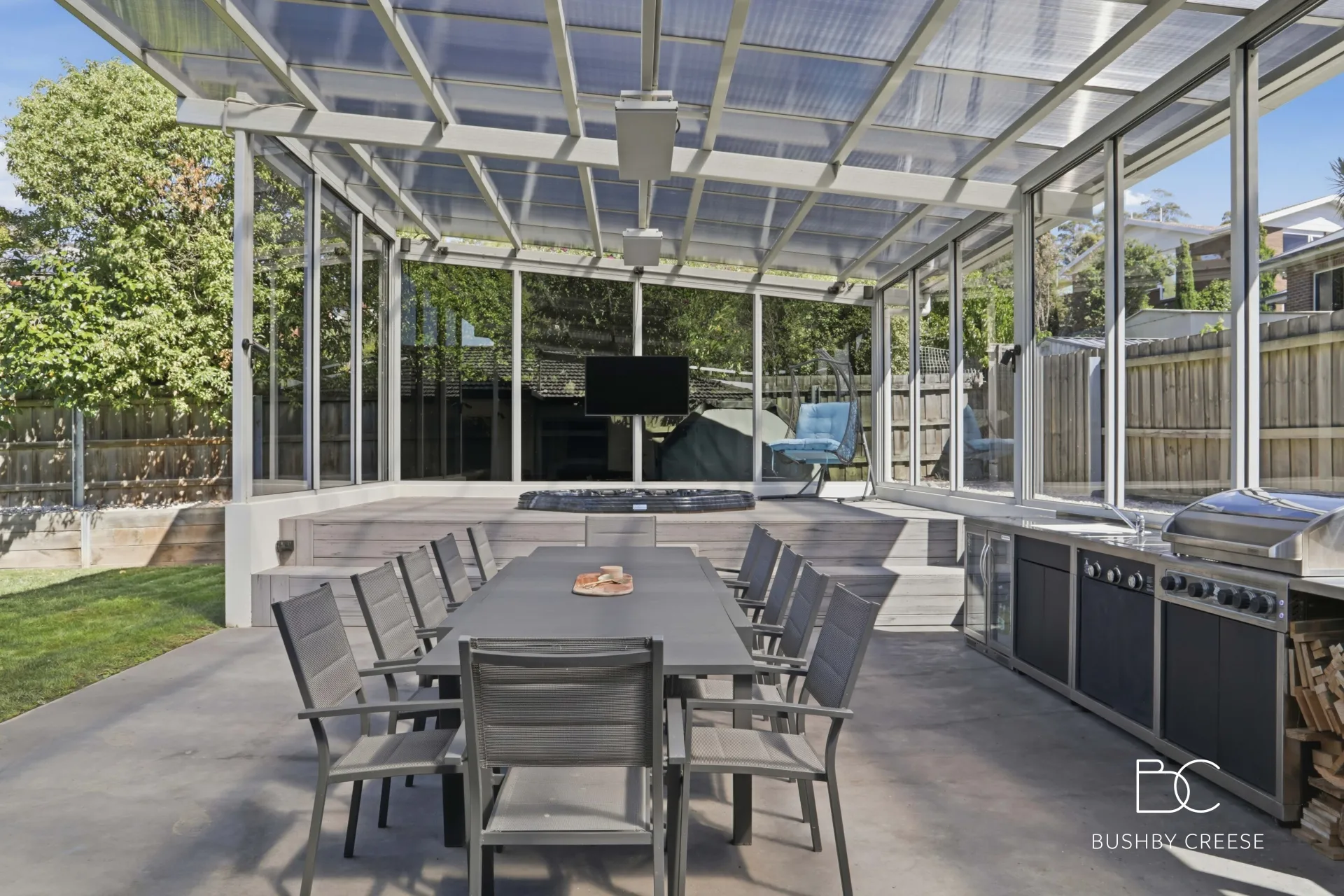 Elevated within the entertaining deck is a jacuzzi, thoughtfully integrated into the space to create the ultimate recreational retreat.
