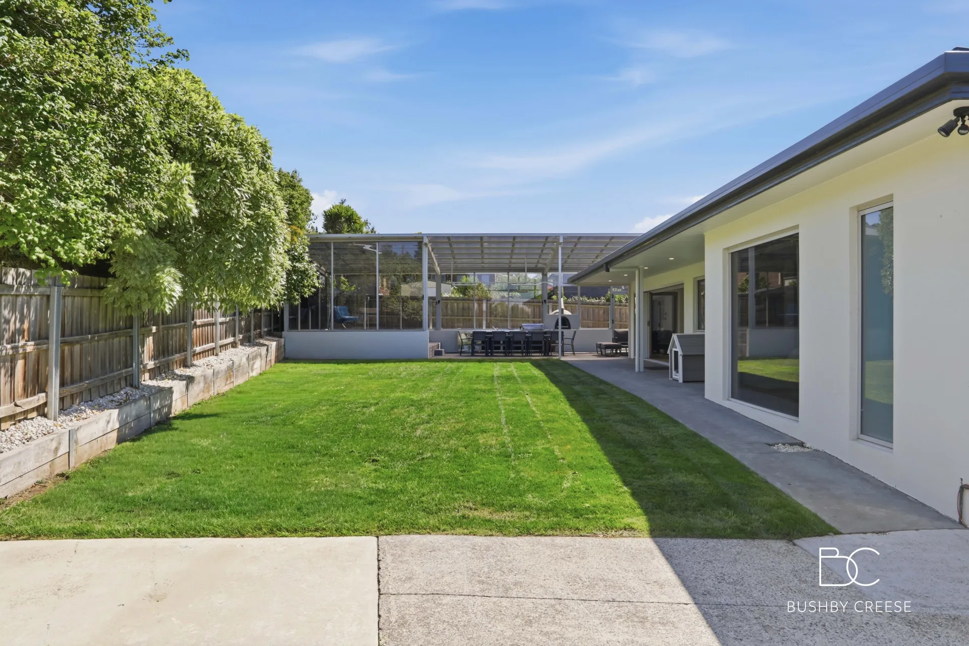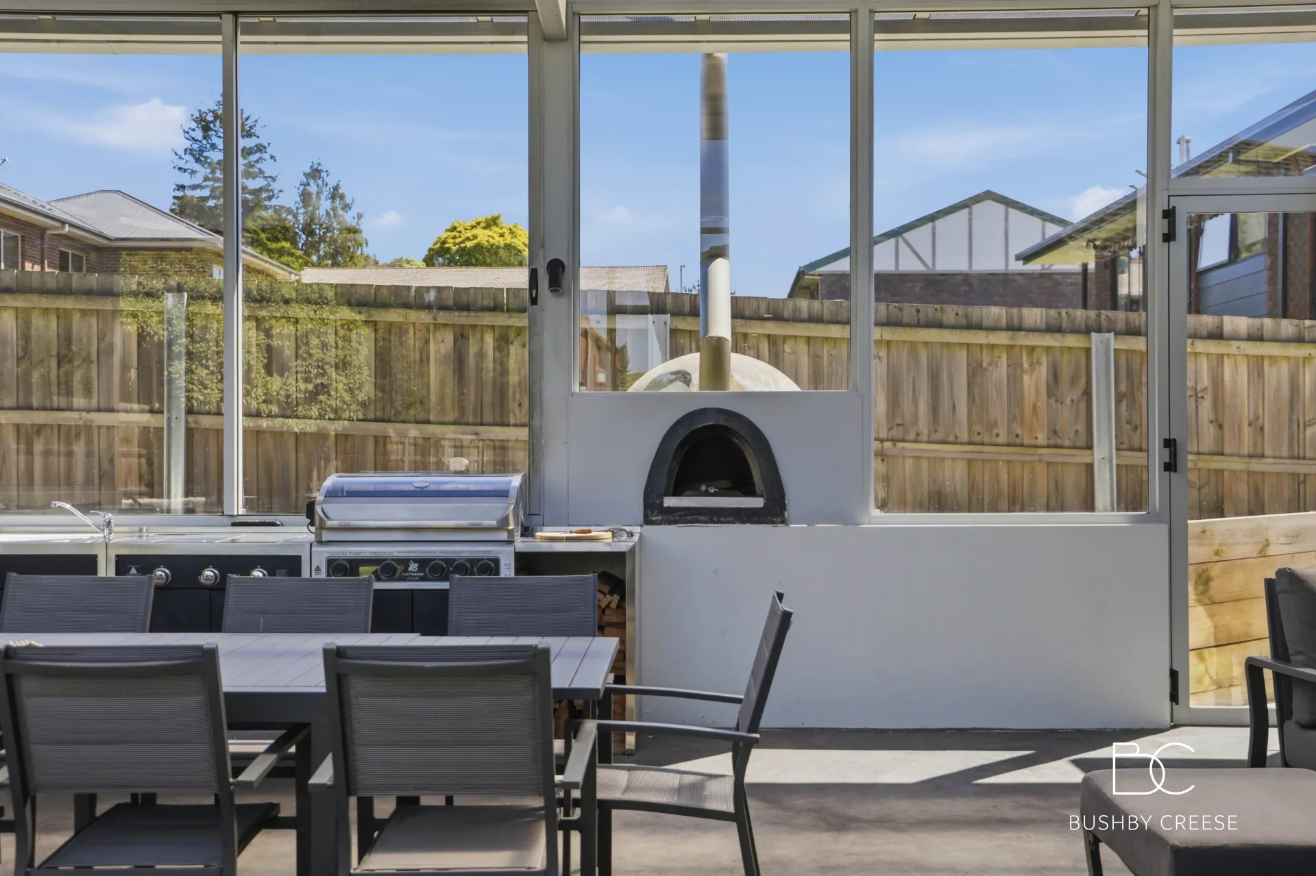 From here, the home opens onto an exceptional covered outdoor entertaining zone, complete with a fully equipped outdoor kitchen featuring a BBQ and woodfire oven, perfect for hosting friends and family in style.