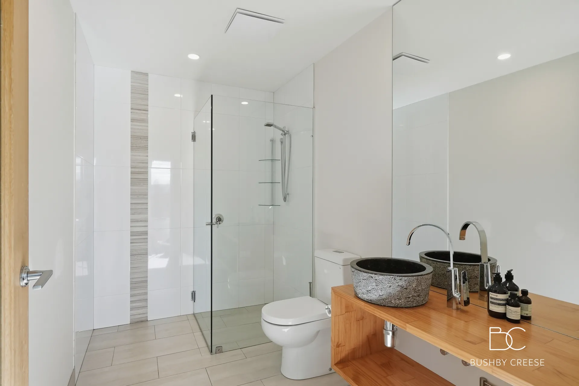 Set across two thoughtfully designed levels, the home has been crafted to maximise functionality and connection to its spectacular surroundings. Timber, brick, and stone elements feature throughout, creating cohesion between the home and its natural environment. Timber flooring and high-end finishes further enhance the sense of warmth and quality that flows through every room.