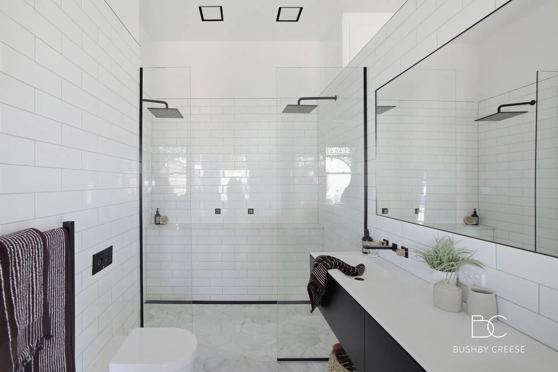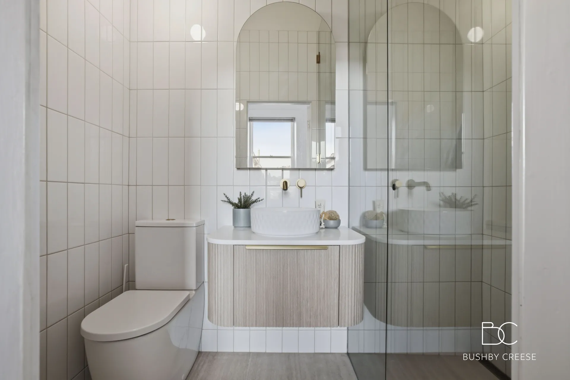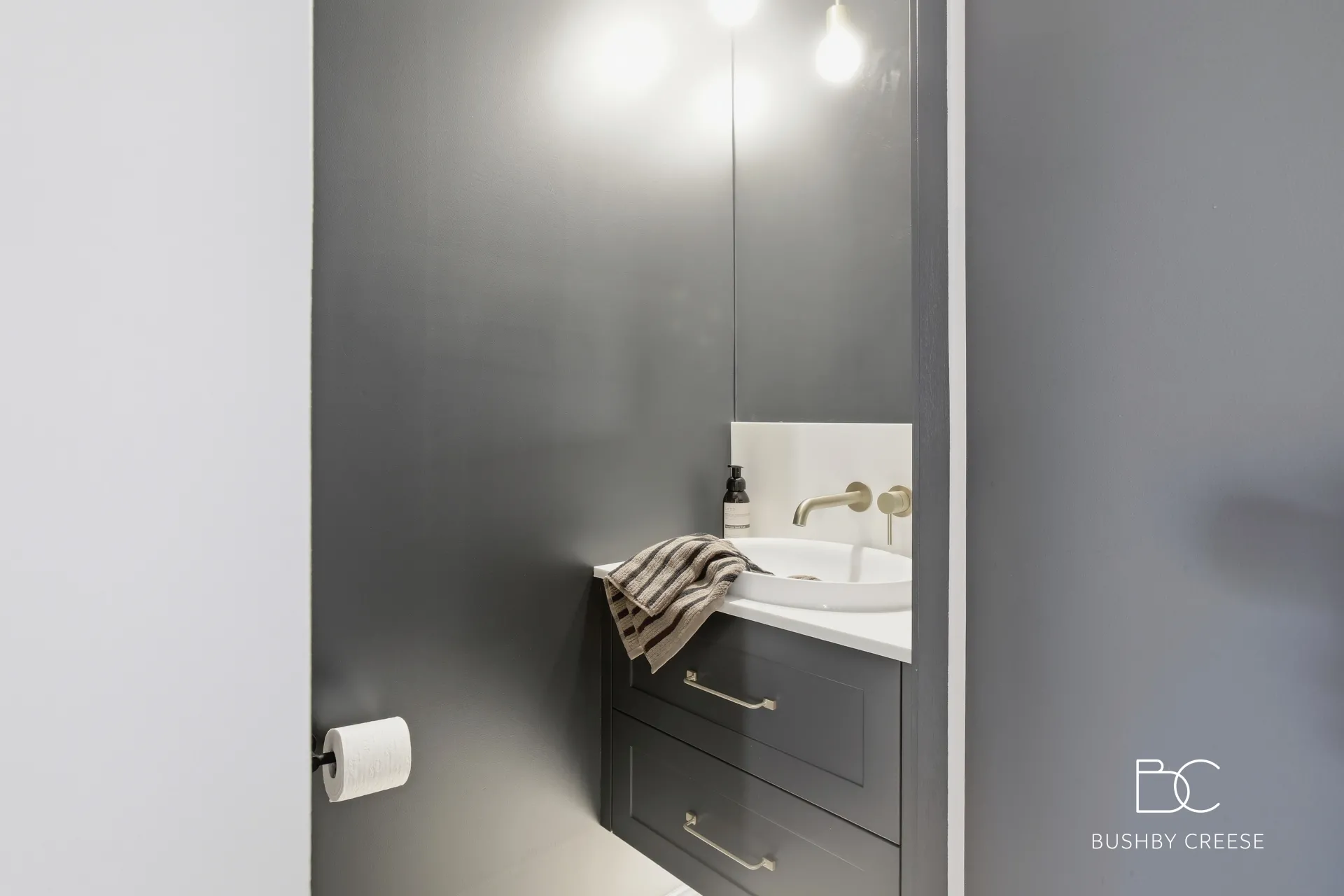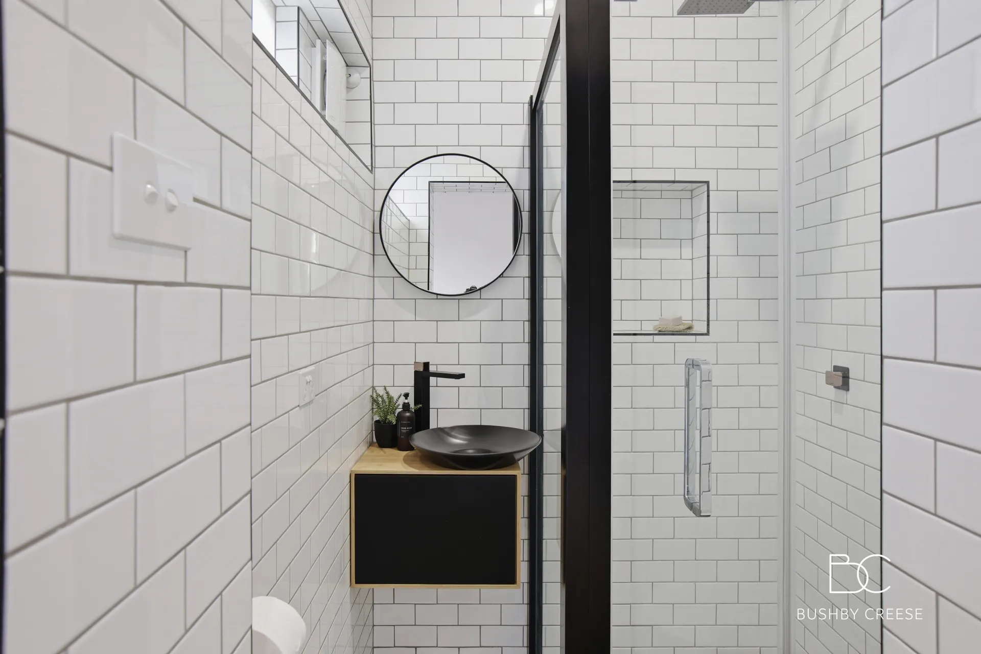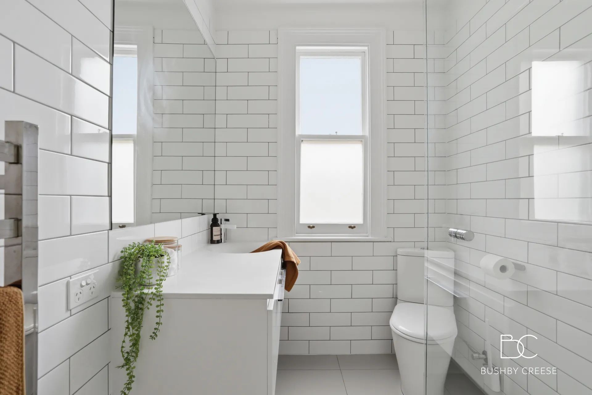 A sophisticated main bathroom is located on the middle level, complemented by a powder room on the ground floor. Each bathroom has been designed in harmony with the home's character, featuring subway tiling and classic fittings and fixtures that echo its heritage.