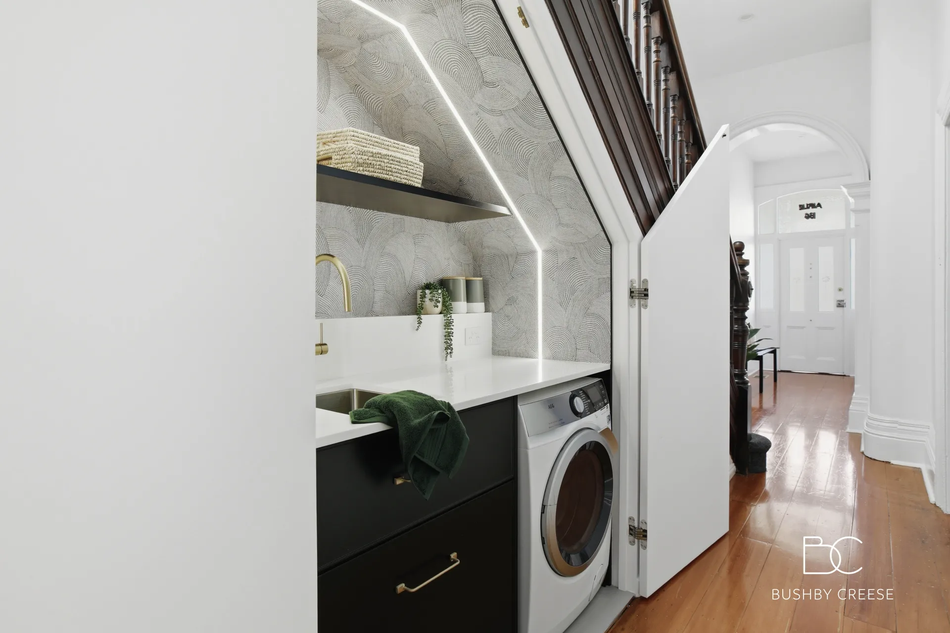 Practical elements have been thoughtfully integrated, including a European laundry discreetly positioned within closets beneath the staircase on the ground level.